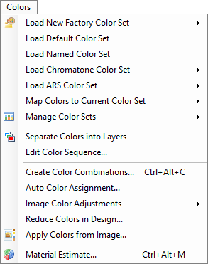 Load New Factory Color SetLoad Default Color SetLoad Named Color SetLoad Chromatone Color SetLoad ARS Color SetMap Colors to Current Color SetManage Color SetsSeparate Colors into LayersEdit Color SequenceCreate Color CombinationsAuto Color AssignmentsImage Color AdjustmentsReduce Colors in DesignApply Color from ImageMaterial Estimate