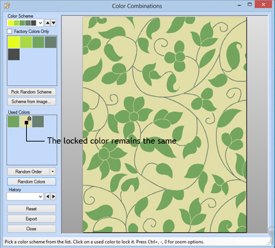 You can lock a particular used color in the design if you don't want to change it. Simply click on that color which you want to lock it from Used Colors setting and an icon of lock will be visible. You can either choose color combination from color scheme or click on Pick Random Scheme button to generate new combinations without changing the locked color