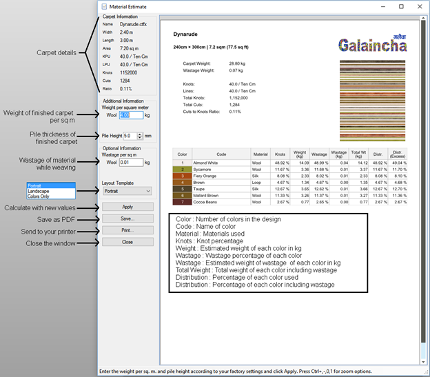 Material Estimate is important for the production of carpet. It will automatically estimate the quantity of each color of yarn to be used, wasted and other information before the actual production starts.